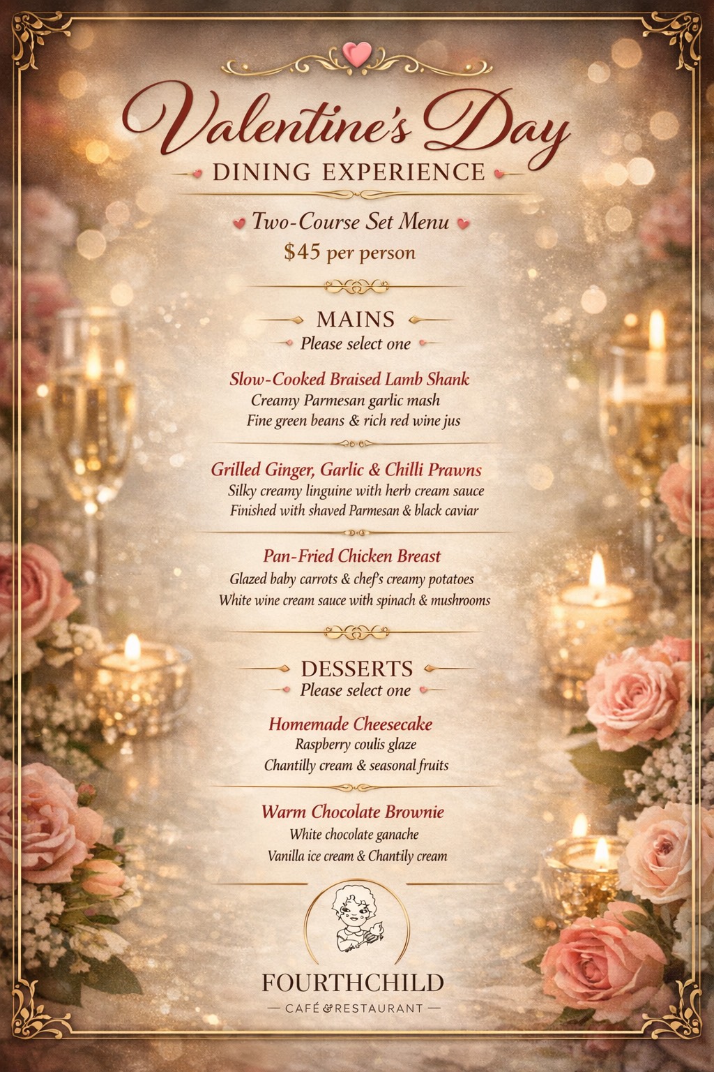 Served with Creamy mash, Green beans, Truss tomato and Red Wine Jus.